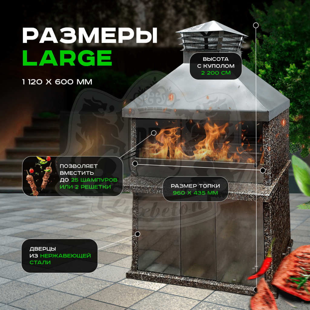 Эта печь барбекю идеально подойдет для любителей уютных семейных ужинов или масштабных встреч на свежем воздухе. Просторная топка (970х440 мм) легко вместит 2 решетки или 25 шампуров, отличное решение для любителей шашлыков и тех кто любит собираться компаниями от 10 человек