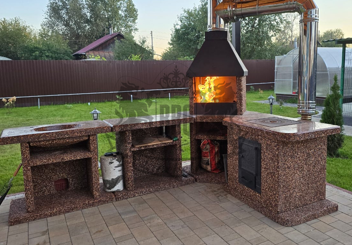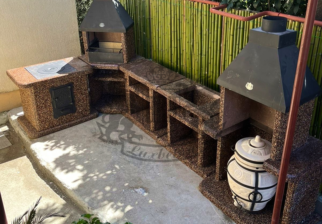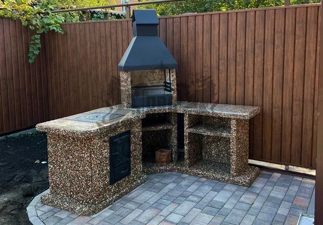 Угловые барбекю-комплексы — компактные уличные конструкции из каменной крошки с металлическими элементами для приготовления блюд на открытом огне. Изделие удобно разместить в углу террасы, беседки или участка. Они экономят место на даче или у дома, сочетая стиль и удобство. В комплексе предусмотрена столешница, места хранения и подключение дымохода для лёгкого использования.
